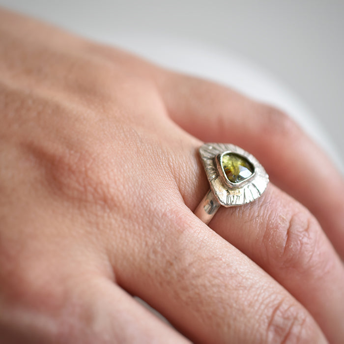El Anillo Percebes es una joya única, forjada a mano en plata 950, que combina el gesto del diseño con la fuerza sutil de las piedras.