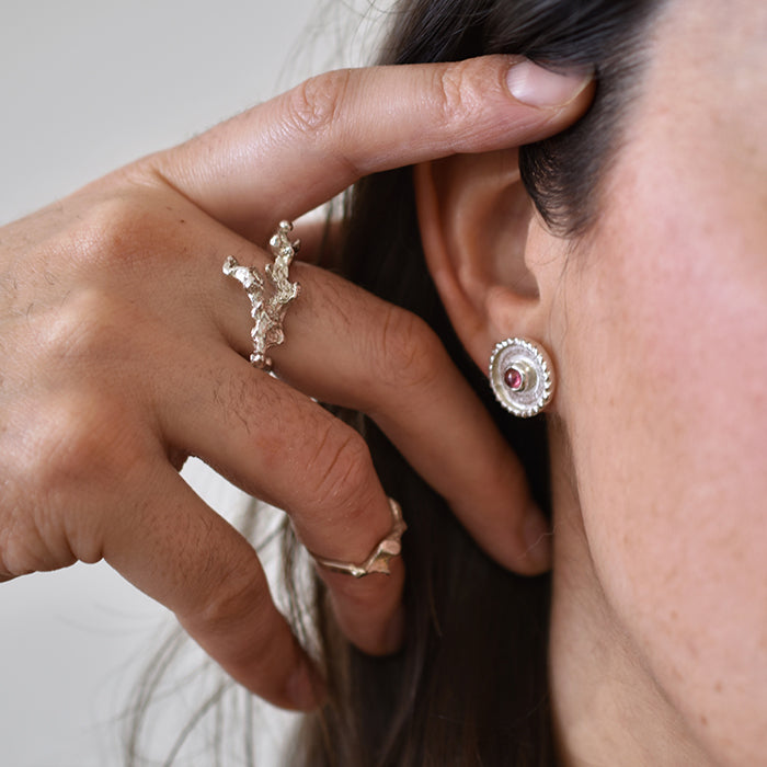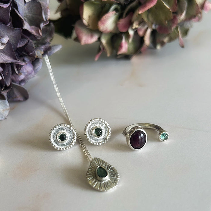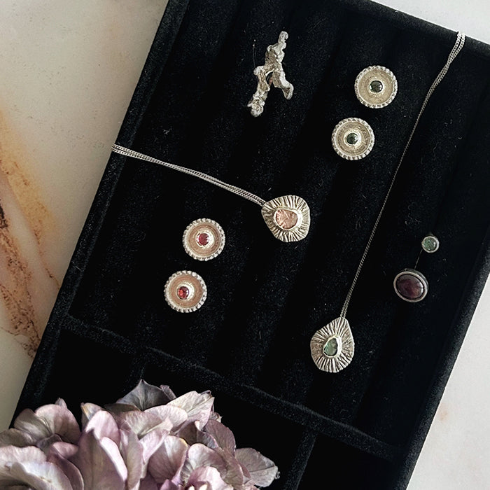 Están acompañados por turmalinas, una piedra que trabaja el autocuidado y la auto-priorización. Para recordar que protegerse también es un acto de amor.