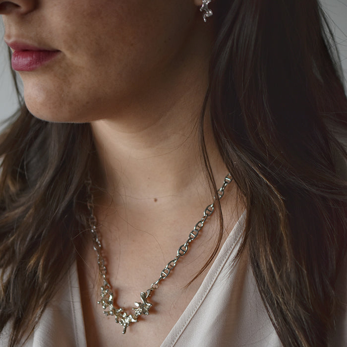 El Collar Sobre Camisa Lokani es una pieza única que combina la elegancia con un diseño moderno y versátil. Hecho a mano en plata o bronce enchapado en oro, este collar está diseñado para ser el complemento perfecto para cualquier estilo. Su diseño lo hace ideal para usar sobre cualquier tipo de camisa, aportando un toque sofisticado y distintivo a tu look diario o para ocasiones especiales. El Collar Sobre Camisa Lokani forma parte de la colección Korala de Maialen Joyería y es perfecto para quienes buscan un accesorio llamativo y lleno de estilo. Eleva tu vestuario con esta pieza exclusiva.