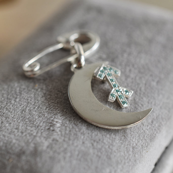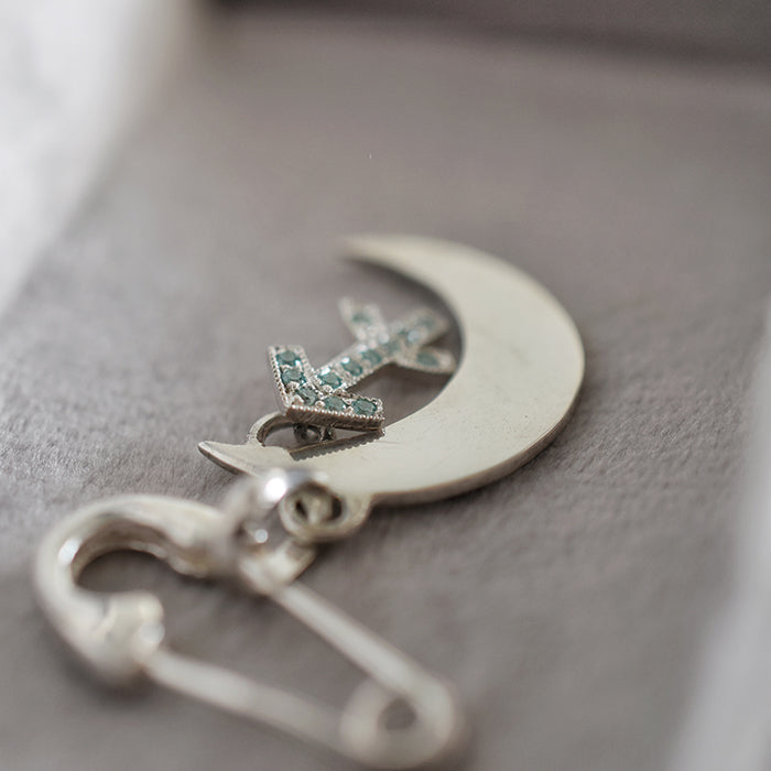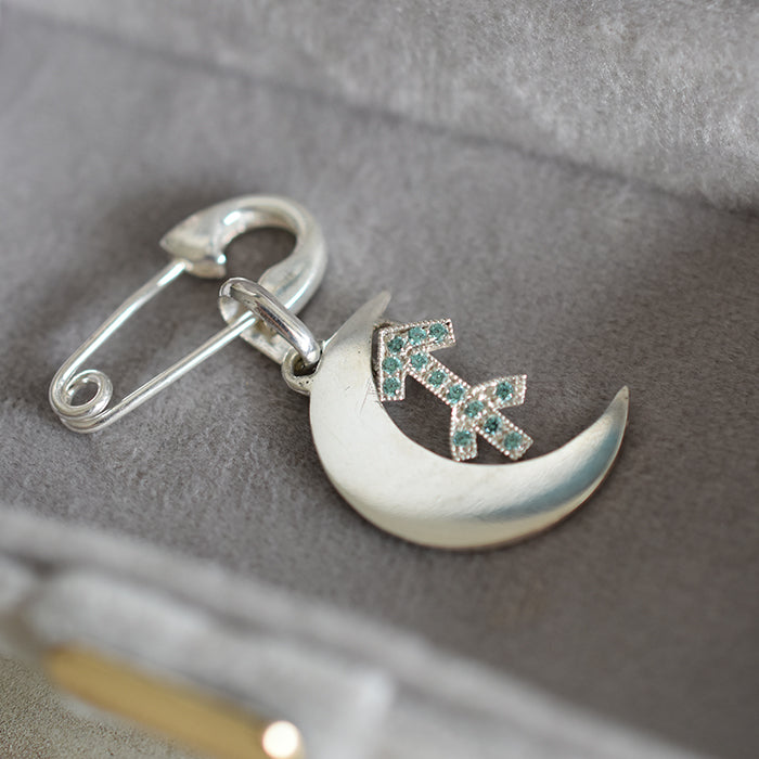 La pieza está hecha en plata, con zircones Swarovski en un verde agua suave. Como aún no puede usarla, le agregamos un alfiler para que pueda acompañarla desde sus mantitas o chalecos, como un pequeño amuleto lleno de intención.