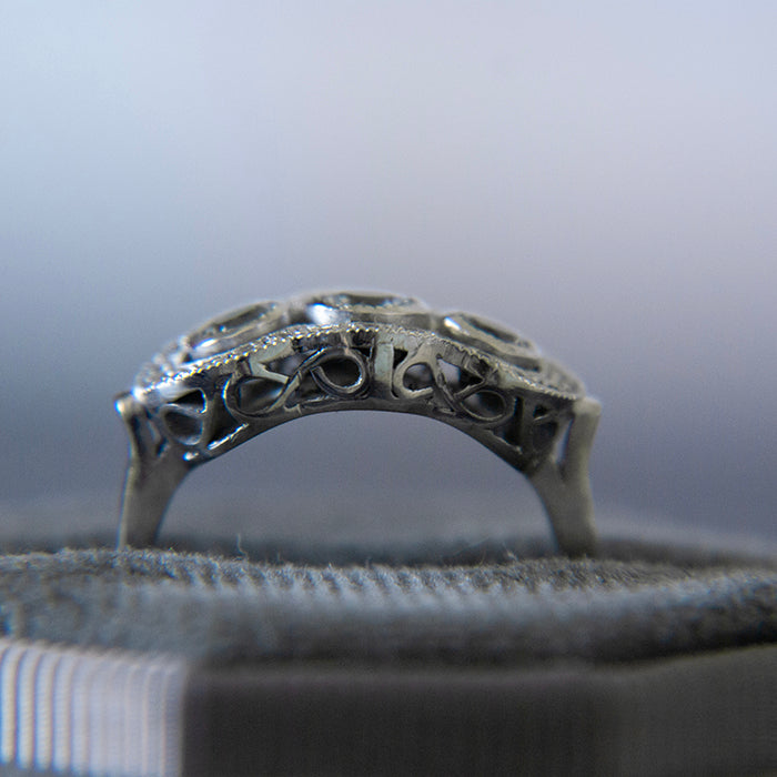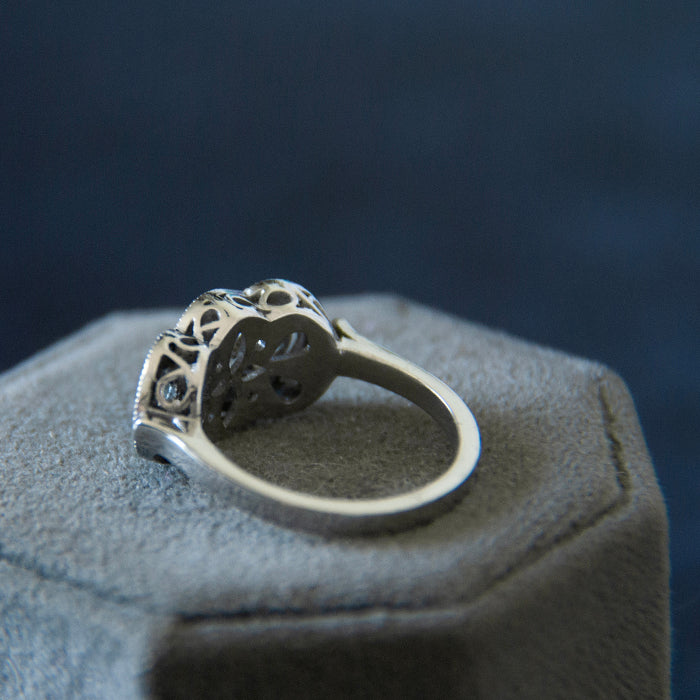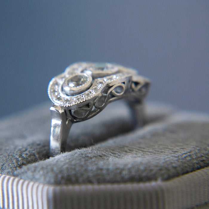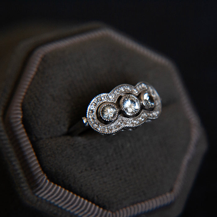 Un anillo para un legado familiar. Un tricillo de zafiros rodeado de más zafiros en platino.